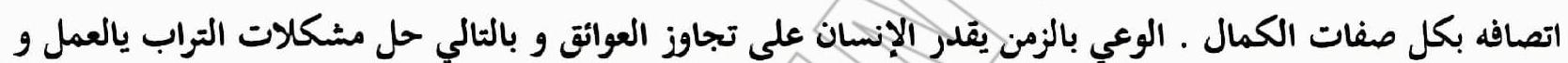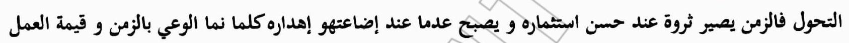 بقيمة الزمن و الهدف من خلقه فأحسن العمل فناز في الدنيا و الآخرة و من الناس من لم يع بقيهة الزمن والغاية من وجوده فكان مآله الخسران المبين في الدنيا و الآخرة. فحسن التعامل مع الزمن هو مسؤولية دينية و دنيوية فالزمن لا يرحم و إن لم يقطعه الإنسان قطعه أي إن لم يغلب الإنسان