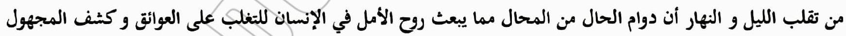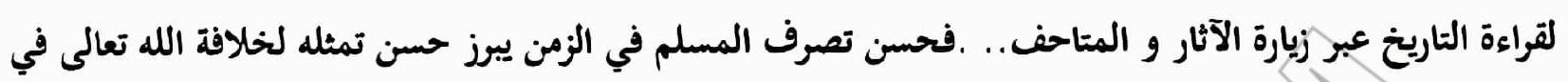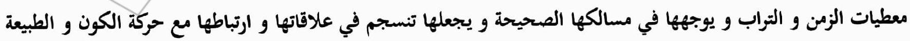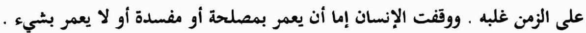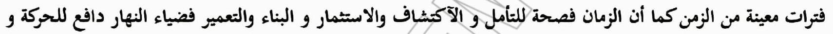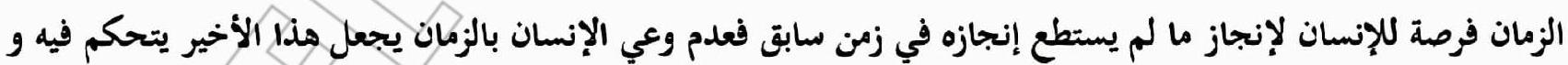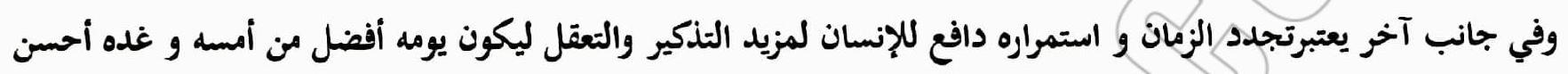 « الزمان هو من نعم الله التى ينغي حسن استغلالها فالزمن قابل للقسمة و مجدد و ممتد و متراخى و في حركة مستمرة يؤثر الزمان على الإنسان وواقعه المعيشى فعمر الإنسان و نشاطه محدد بفترة زمنية عليه استمارها و إلا لن تتوفر له فرصة فئ للتدارك و الرجوع إلى الوراء في الزمن.