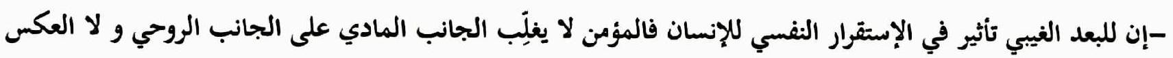 الإيمان بعالم الغيب : نفي للصدفة و العبية +له أثر على ضمير الإنسان و سلوكه +يجعل الإنسان فاعلا في واقعه + يسرتواصل الإنسان مع ببي جنسه و تواصله مع الكون .الغيب مصدر معرفة و هداية و إصلاح :للإنسان +للواقع