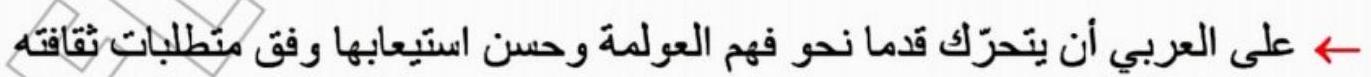 - انشـال العالم اليوم بقضـايا العولمة ورفاهيمها واختَاف الآراء حول انعكاسـاتها على الدرل الناميـة ومنها العالم العربي والإسلامي. – العولمـة ظـاهرة قادمـة مـن الغـرب مـن مجتمعـات متقدّمـة حضــاريَا إلى مجتمعـات ناميِة ومتخلَفة و التعامل معها يطرح العديد من الإشكالِّات.