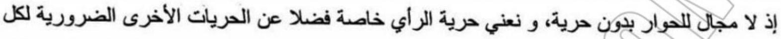 لا مَّــاص من توفر المُروط الأساسية لإقامة الحوار انطلاقًا من قاعذة مبدنية هي ضرورة تُوفر الحرية