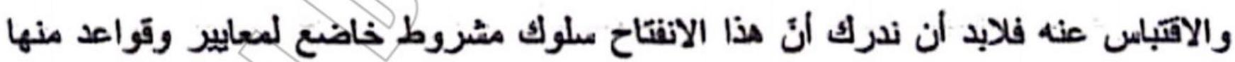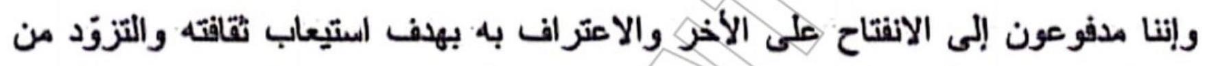 صطصحيح أن الحوار مطلب إنساني و ضروهة ثناريخية إلا أن التعامل مـع الآخـر و خاصة في زمنتا المعاصر زمن المصلحة و الاتتهازية و المغلطة يتاج إلى الكثير من الحذر إذ لا بد من الاتقاء و حسن الاختيار لأه ليس كل ما يأتينا من روافد إيجابيا و جاهزال التعامل معه دون احتراز أي لا بد من