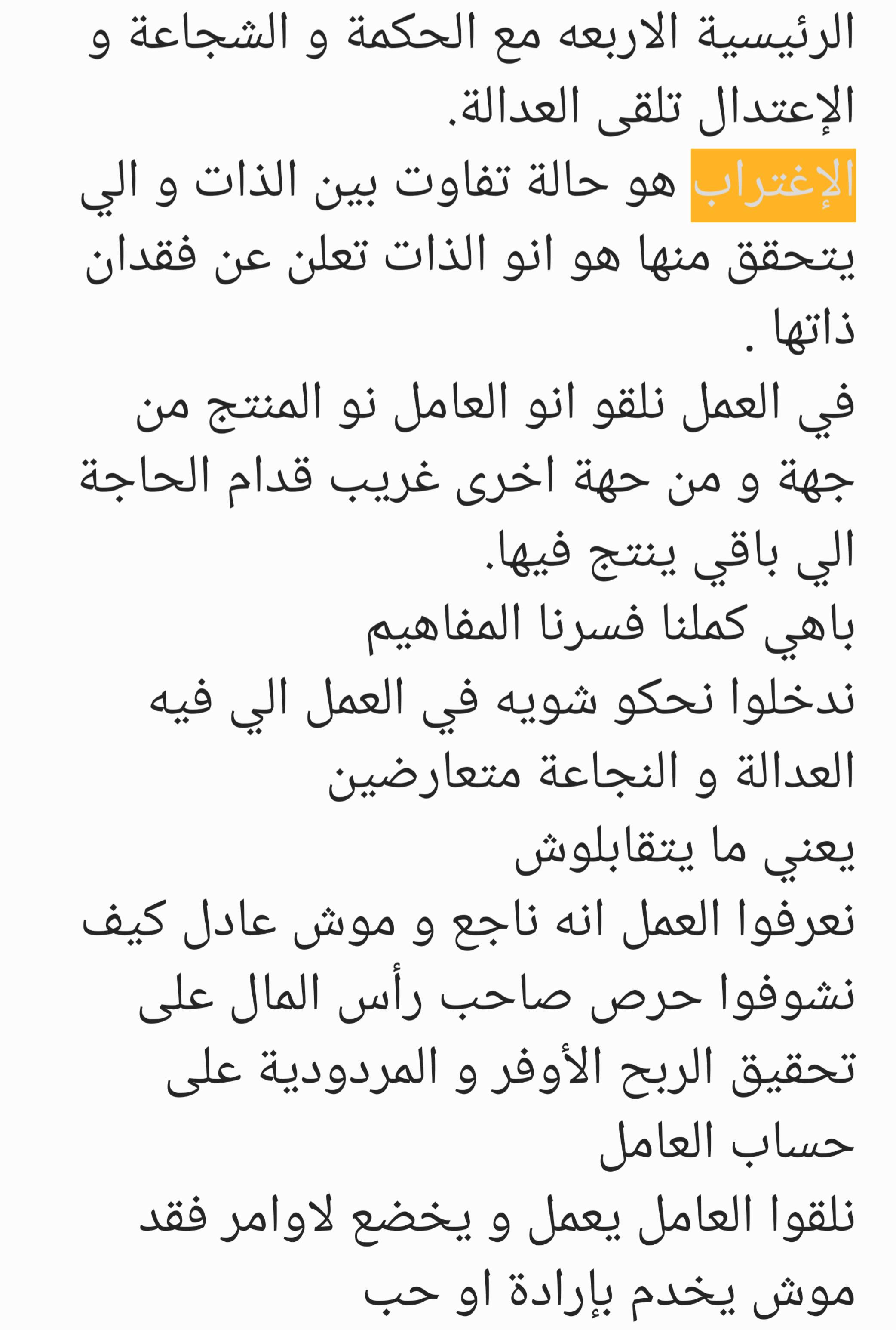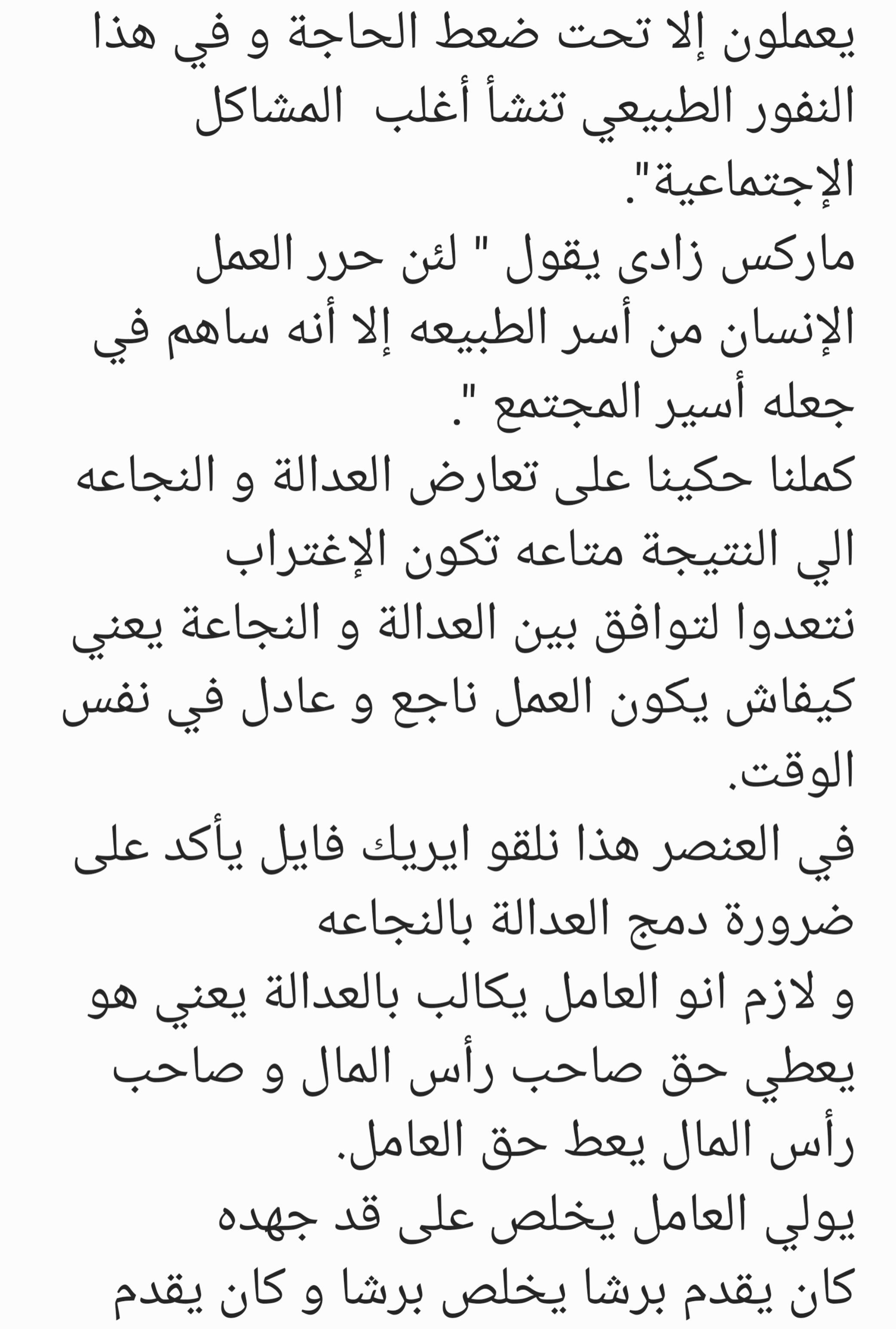 ماركس زادى يقول » لئن حرر العمل الإنسان من أسر الطبيعه إلا أنه ساهم في العي جعله أسير المجتمع « . كملنا حكينا على تعارض العدالة و النجاعه الي النتيجة متاعه تكون الإغتراب البراب نتعدوا لتوافق بين العدالة و النجاعة يعني كيفاش يكون العمل ناجع و عادل في نفس