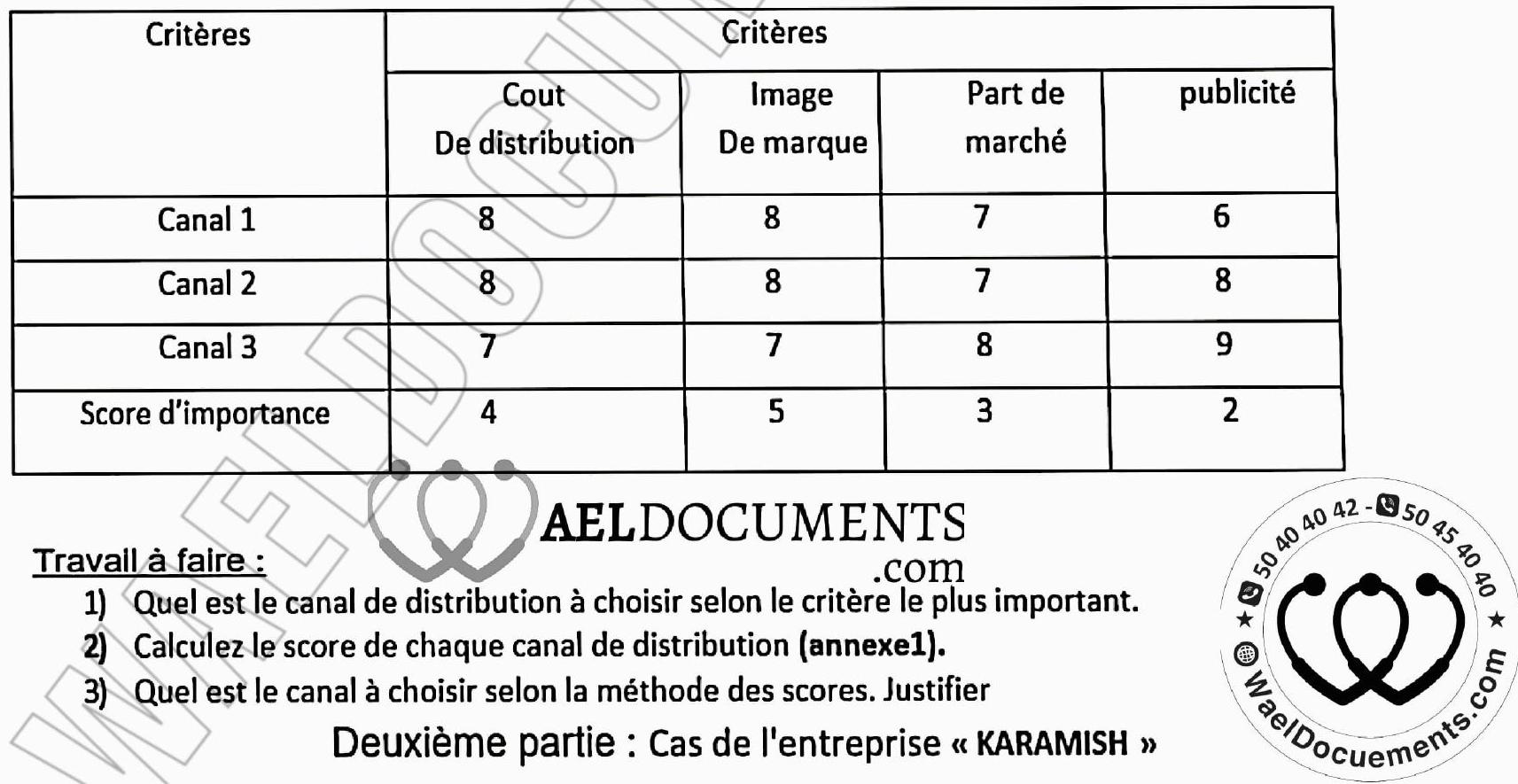L’entreprise «AMIR \&TAYSSIR » est spécialisée dans la fabrication et la commercialisation des accessoires de décoration. Dans le cadre de la promotion des ventes et l’amélioration de la part de marché, la société a réalisé une étude sur ses différents canaux de distribution. Elle vous fournit les moyennes calculées à partir des évaluations sur une échelle allant de 1 (pas important) à 10 (très important) résumées dans le tableau ci-après: