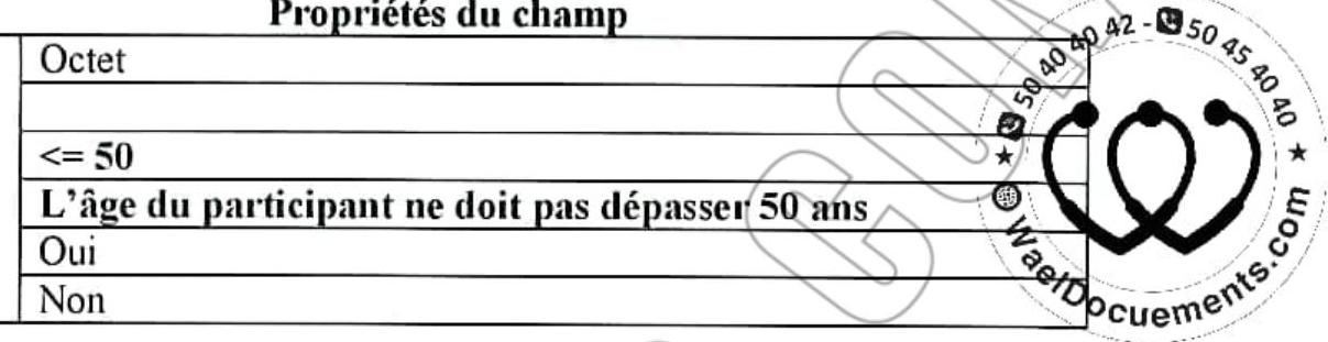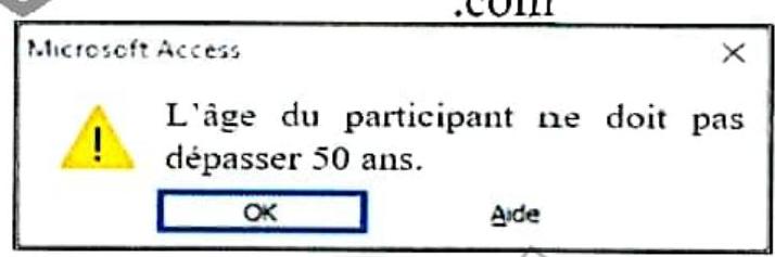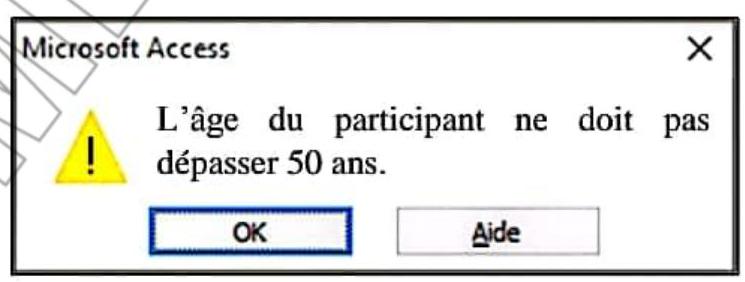 3) Le responsable du club exige que l’âge d’un participant soit inférieur ou égal à 50 ans. Pour cela, le message d’erreur ci-contre s’affichera lorsque cette contrainte n’est pas respectée lors de la saisie des données.