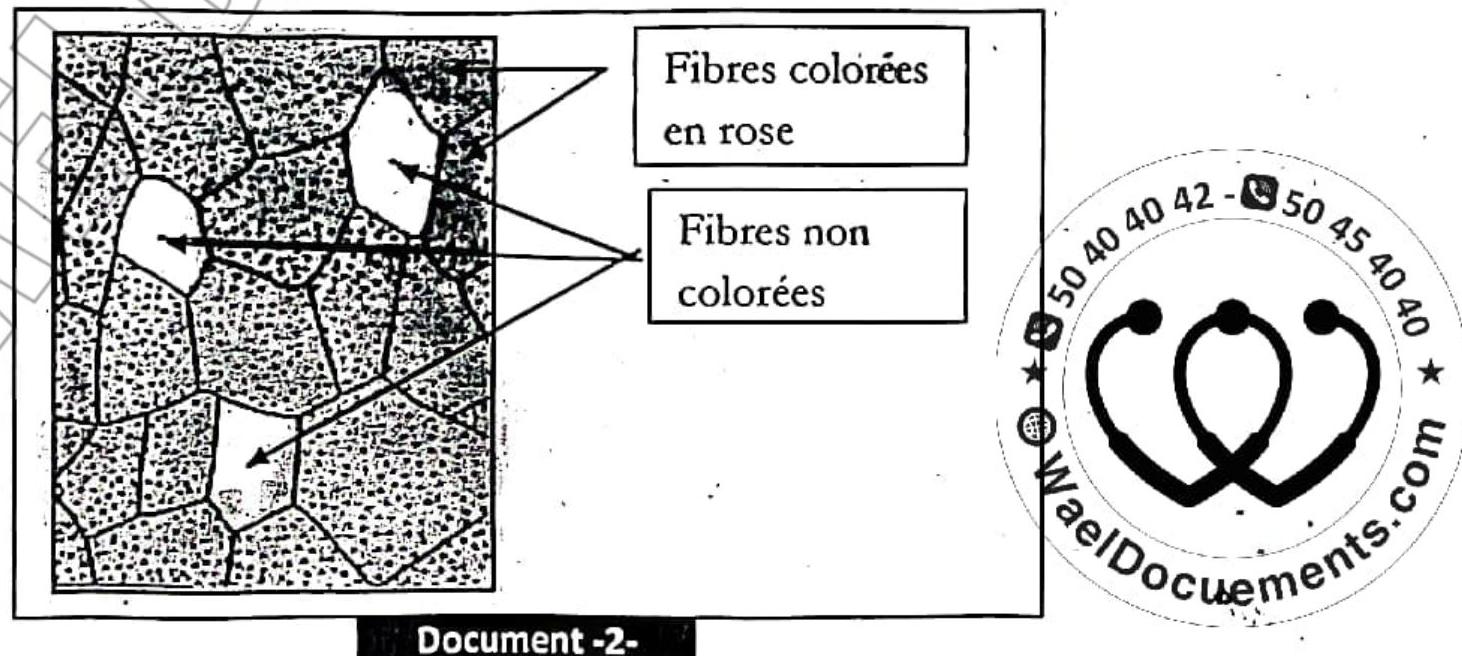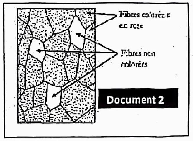 On stimule de façon prolongée le motoneurone à qui appartient l’élément $A$, puis on réalise des coupes histologiques dans le muscle à qui appartient l’élément $B$ en utilisant un colorant spécifique qui colore le glycogène en rose. Le document 2 montre les résultats abstenus.