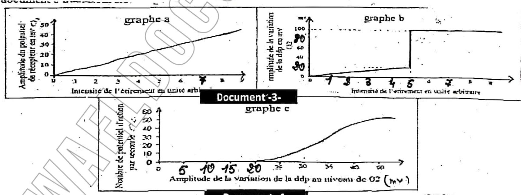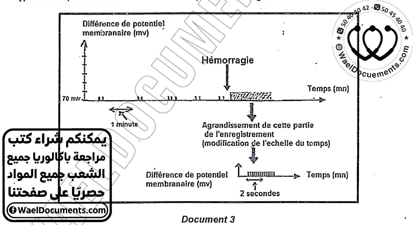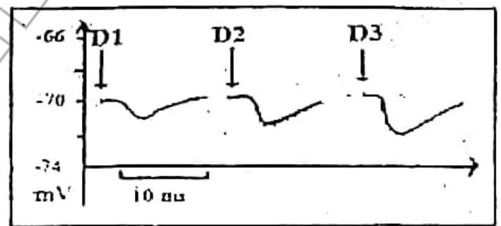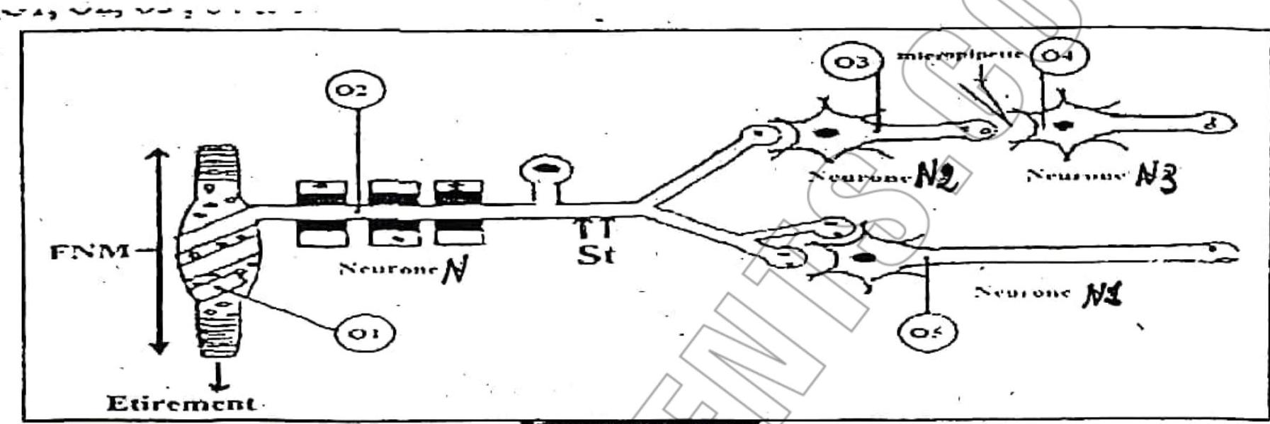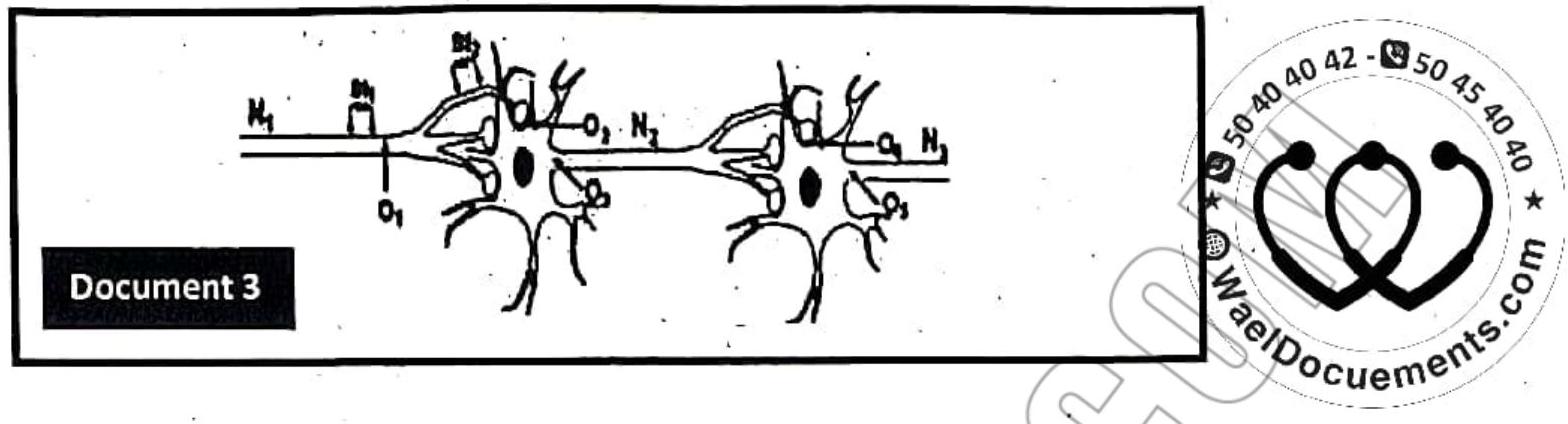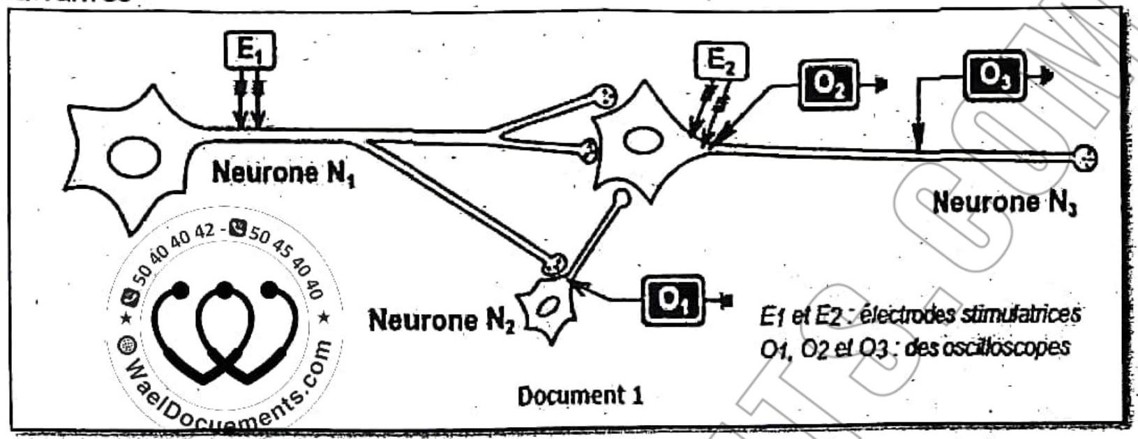 On se propose d’étudier certains phénomènes électriques au niveau d’une chaine neuronique. Le document 3 suivant montre une chaine de trois neurones N1, N2 et N3.
