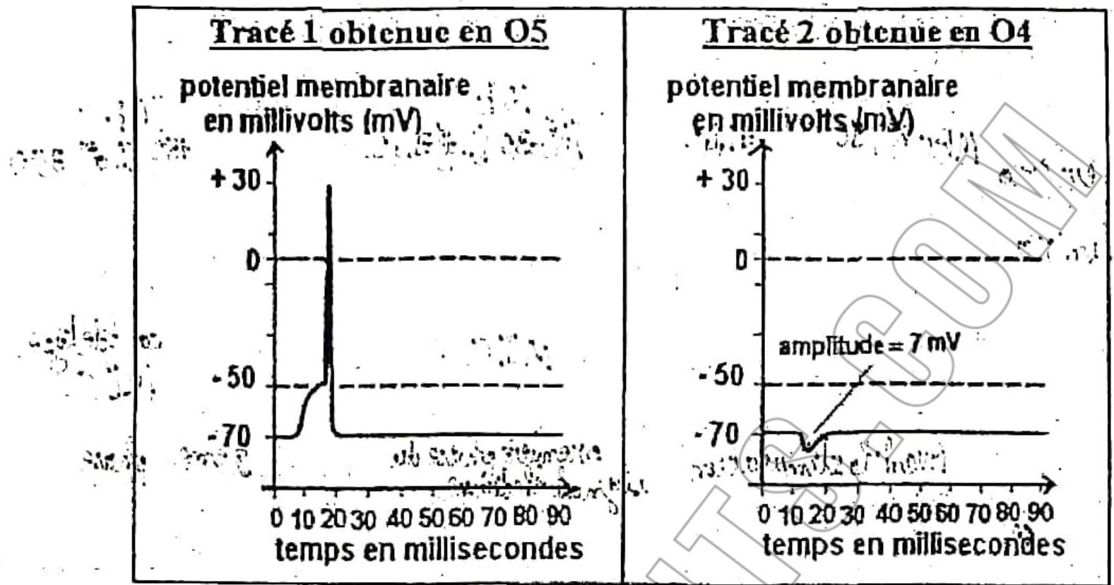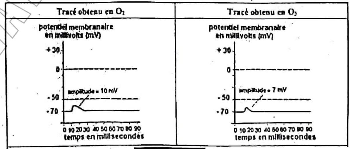 2) En tenant compte de ces tracés, indiquez la nature de la réponse que l’on peut obtenir en $\mathrm{O} 3$ si on porte en $\mathrm{S}+2$ trais stimulations rapprochées et de même intensité que celle appliquée dans l’expérience 2 : justifiez votre réponse.