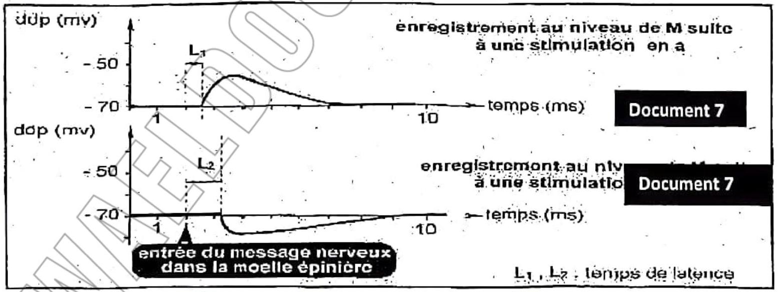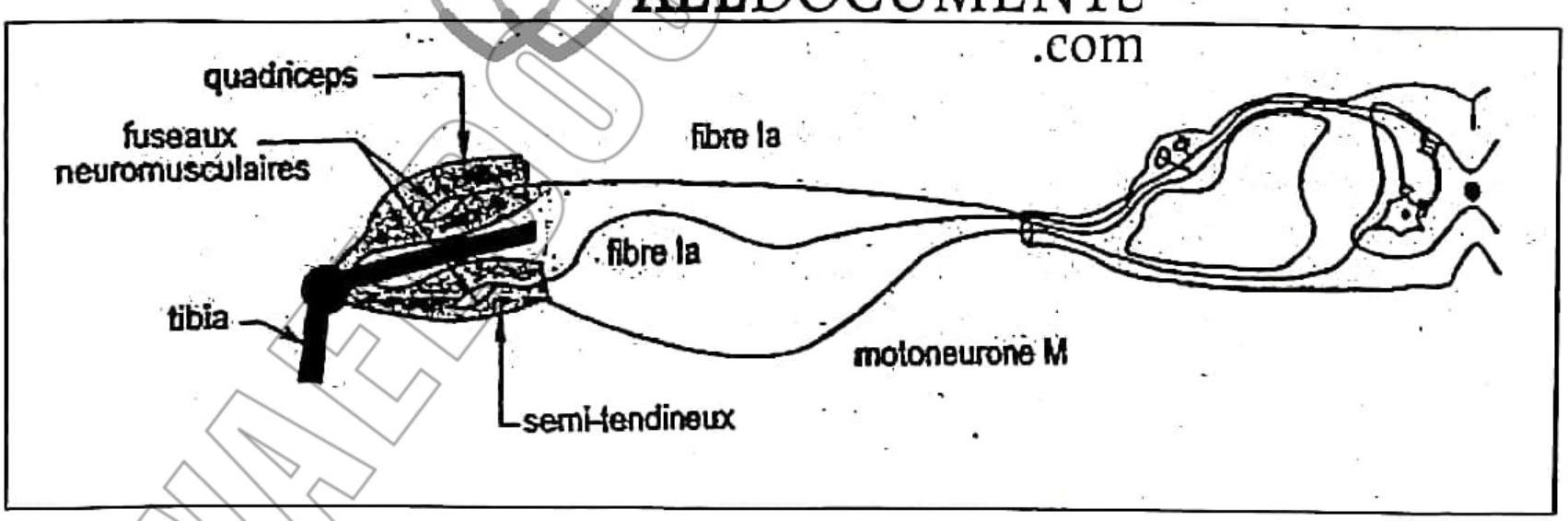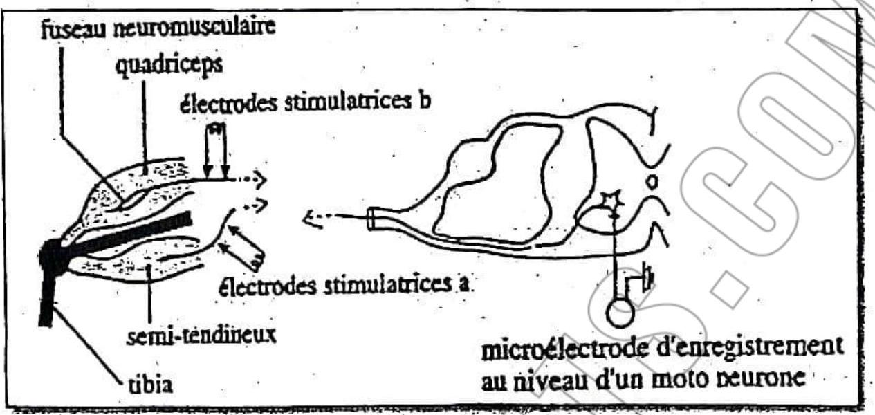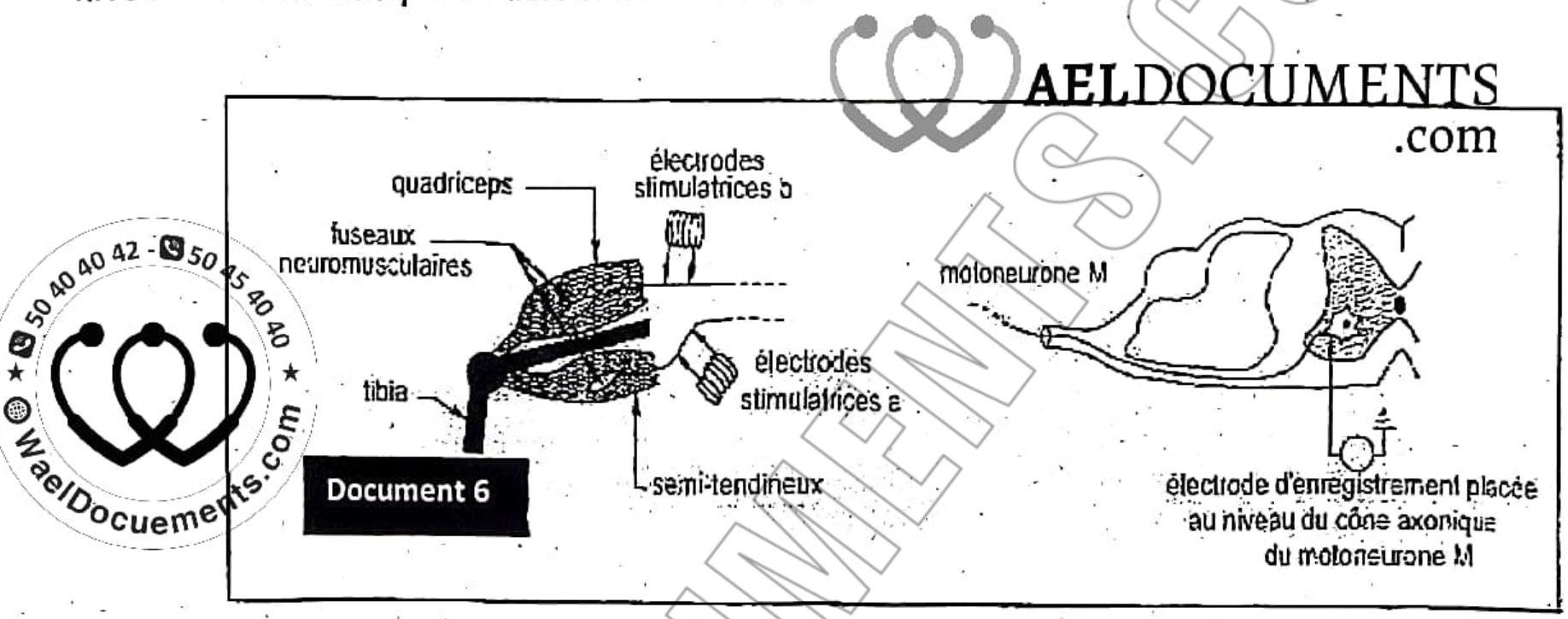 Le dispositif expérimental représenté dans le document 6 montre l’emplacement de deux muscles antagonistes; le quadriceps (extenseur) et le semi tendineux (fléchisseur). Deux électrodes stimulatrices a et b sont placées au niveau des fibres afférentes provenant des fuseaux neuromusculaires des deux muscles. Une électrode réceptrice, reliée à un oscilloscope est placée au niveau du cône axonique du matoneurone M relié à l’un de deux muscles.