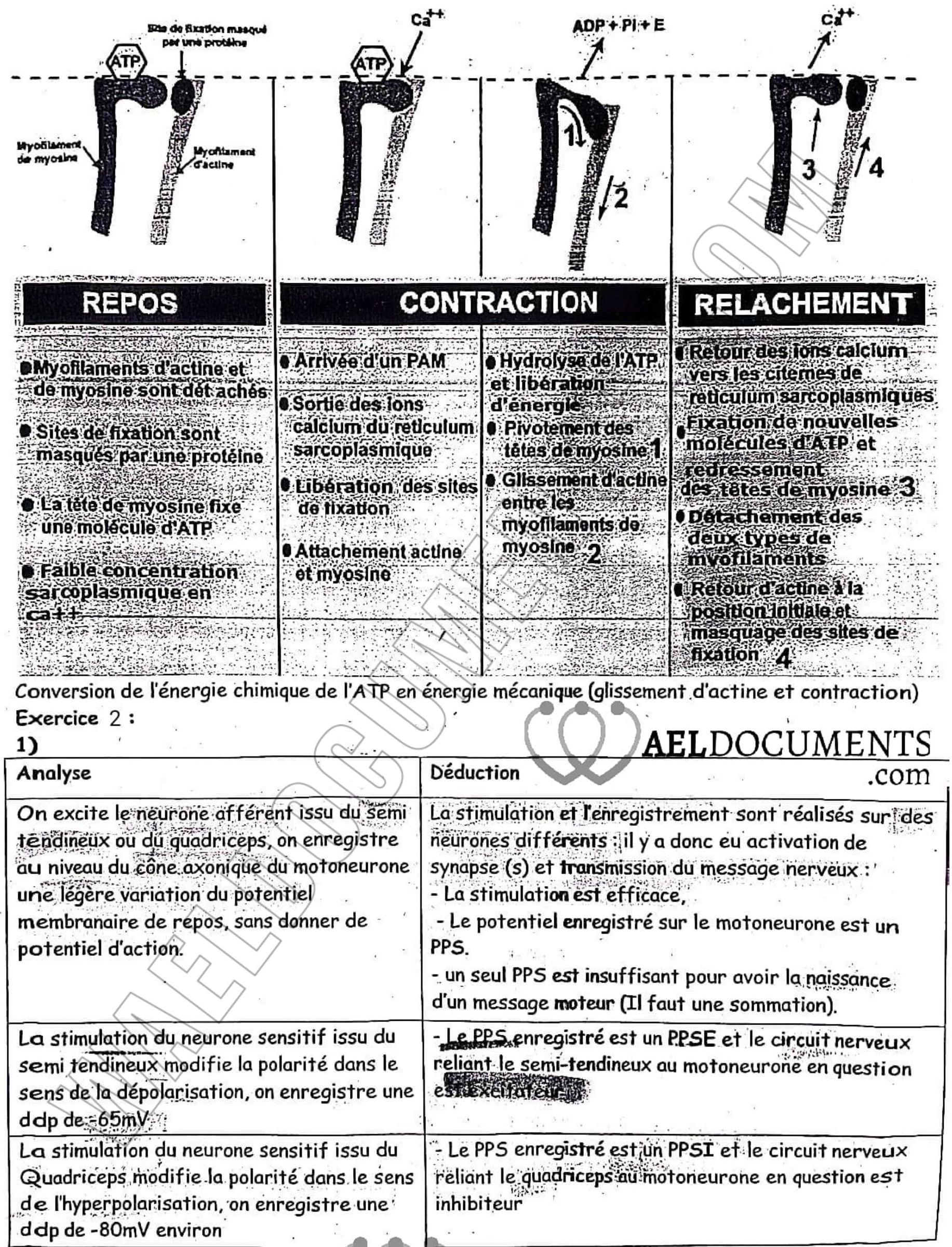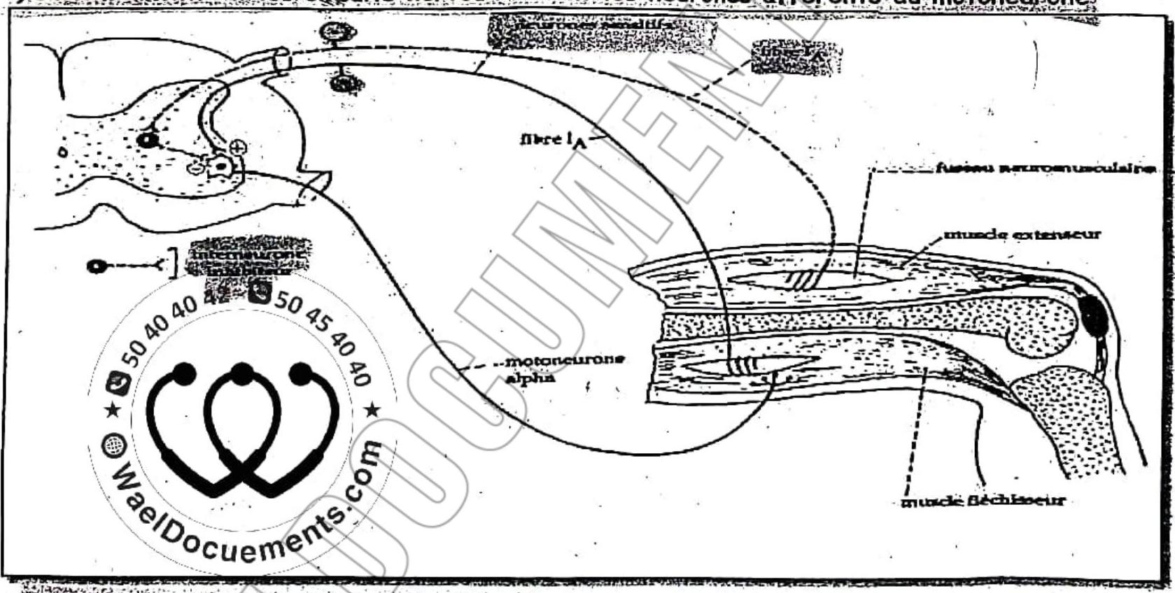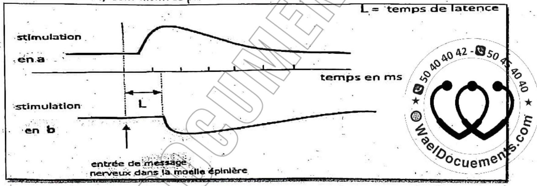 Le dispositif expérimental représenté dans le document 6 montre l’emplacement de deux muscles antagonistes; le quadriceps (extenseur) et le semi tendineux (fléchisseur). Deux électrodes stimulatrices a et b sont placées au niveau des fibres afférentes provenant des fuseaux neuromusculaires des deux muscles. Une électrode réceptrice, reliée à un oscilloscope est placée au niveau du cône axonique du matoneurone M relié à l’un de deux muscles.