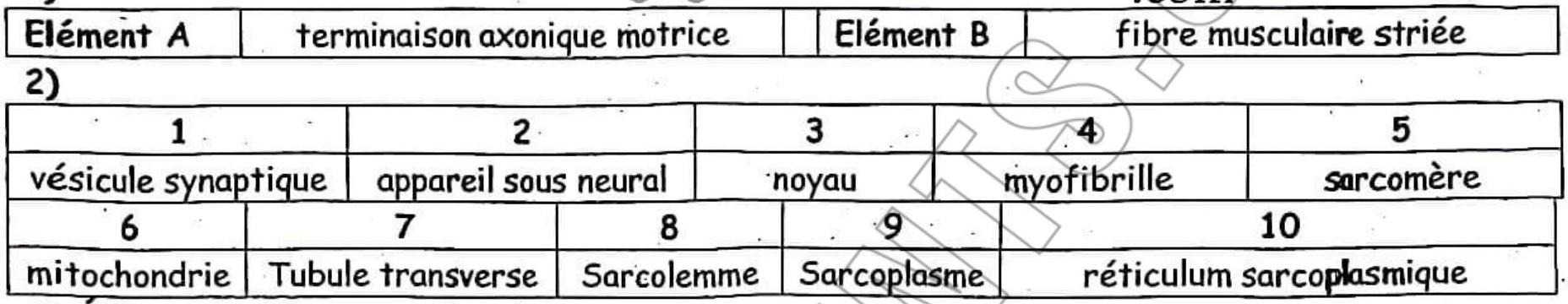 \hline Elément $A$ & terminaison axonique motrice & Elément B & fibre musculaire striée \