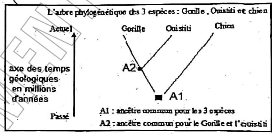 - Le nombre de différences est faible entre le Gorille et l’ouistiti, donc le degré de parenté est fort, donc l’ancêtre commun est plus proche dans.le temps
